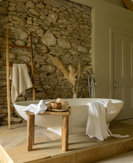 This stunning Cathedral Suite features vaulted ceilings and original 1700’s pitched beams. The free-standing stone bathtub is a real wow factor, set beneath the exposed stone wall section. This bedroom also includes a separate ensuite & walk-in shower.