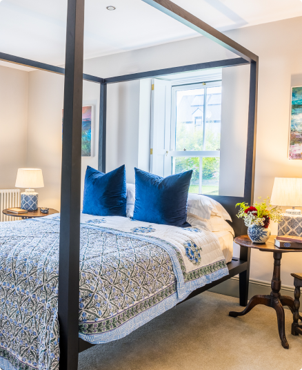 The Captains Room is named after Captain George Sandes, who lived here at Dunowen until his death in 1876. This room has lovely sunny views into the courtyard with its old bell tower. Renovated in 2023 it now has a stunning kingsize 4-poster bed, replica Georgian window shutters, antique furniture and beautiful coastal artwork by local artists. The room has a free-standing bathtub and a Travertine marble ensuite shower-room.