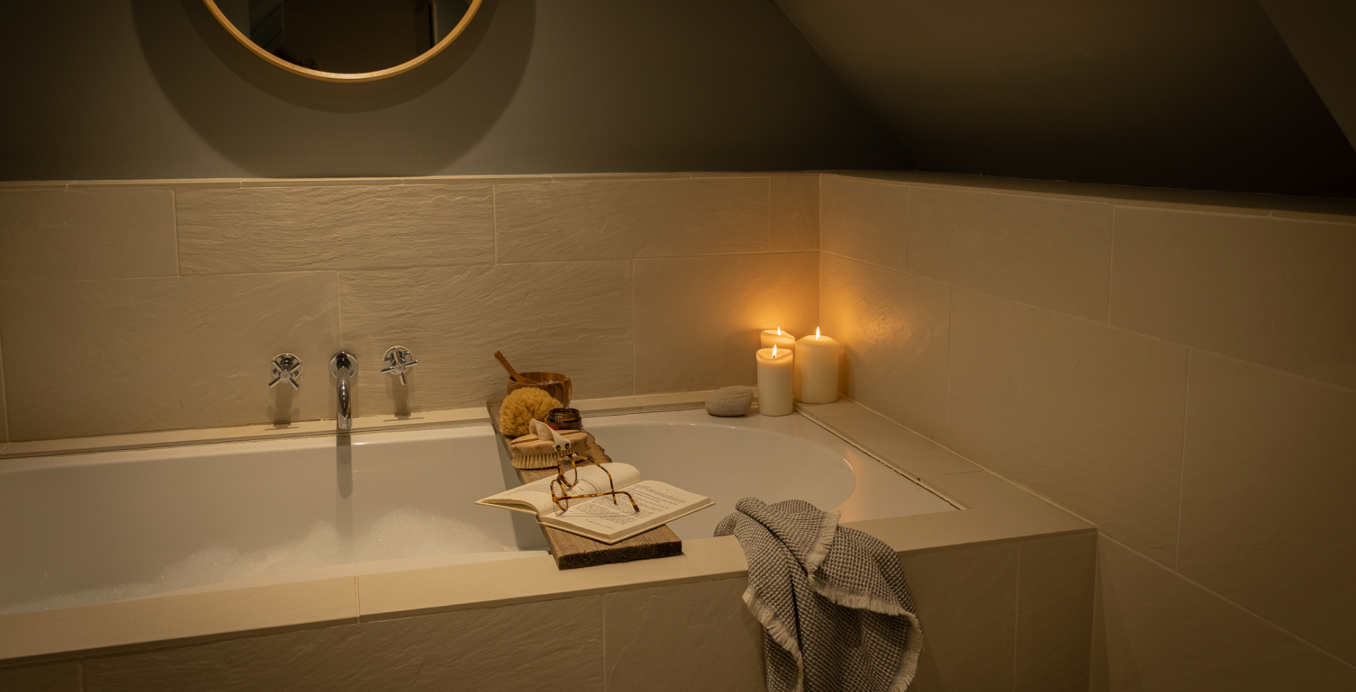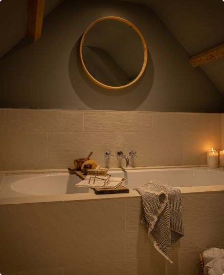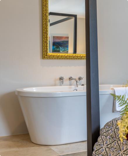 The Studio Suite occupies the entire top floor of one wing of the house, with four large roof windows, gorgeous light and stunning views towards the West. It was once an artist studio used by Noel Redding’s former partner, Carol Appleby. The ensuite bathroom has the original 1700’s beams, which you can admire as you soak in the bathtub!