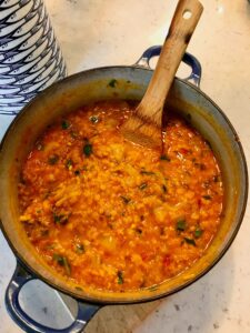 5. Add in the lentils, 600ml water and salt. Stir and bring to the boil. Cover lightly with a lid, reduce the heat and allow to simmer for approx 45 mins.